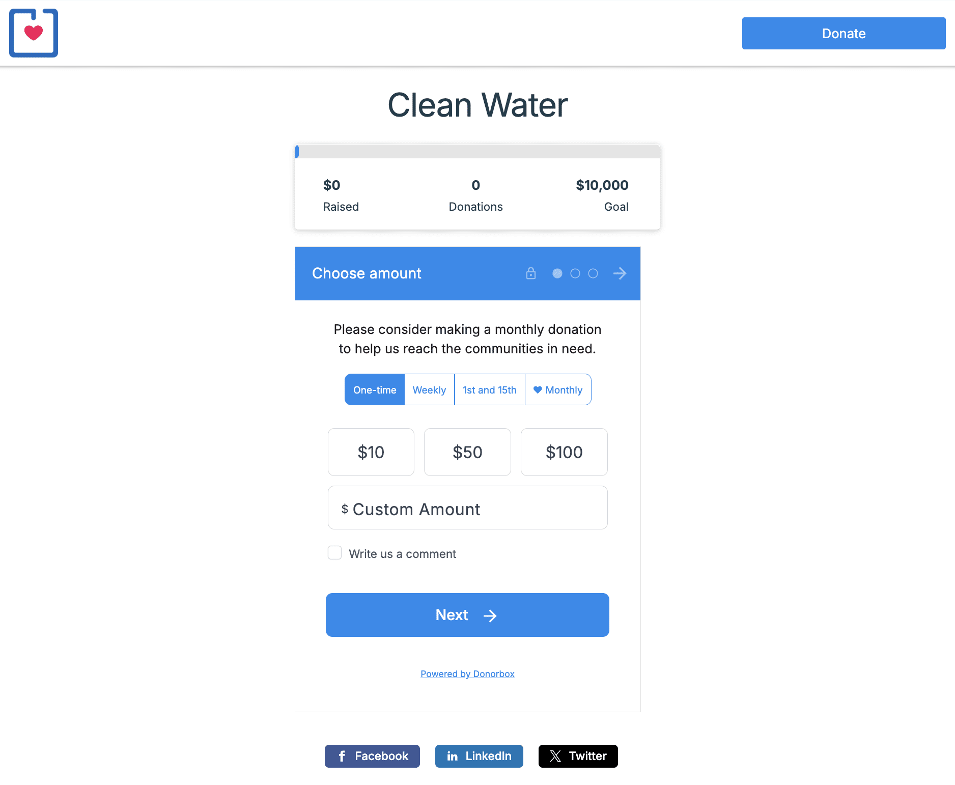 Look at the below crowdfunding page on Donorbox – there are 3 donation intervals added to the form. The default is one-time while the preferred is monthly (marked with a tiny heart icon).