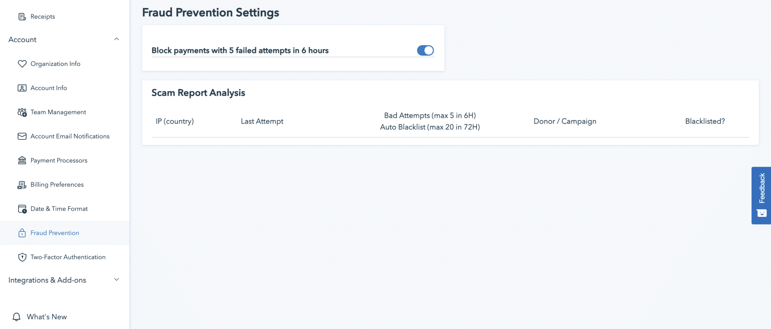 While in the Fraud Detection tab, you will be able to review suspicious donations, which appear after five failed credit card attempts have been made from one account. When you turn on the blocking setting, if a user has five failed payments occur within six hours, the user will be automatically blocked and the payments will not go through. This should deter those using Donorbox as a donation platform to test stolen cards.