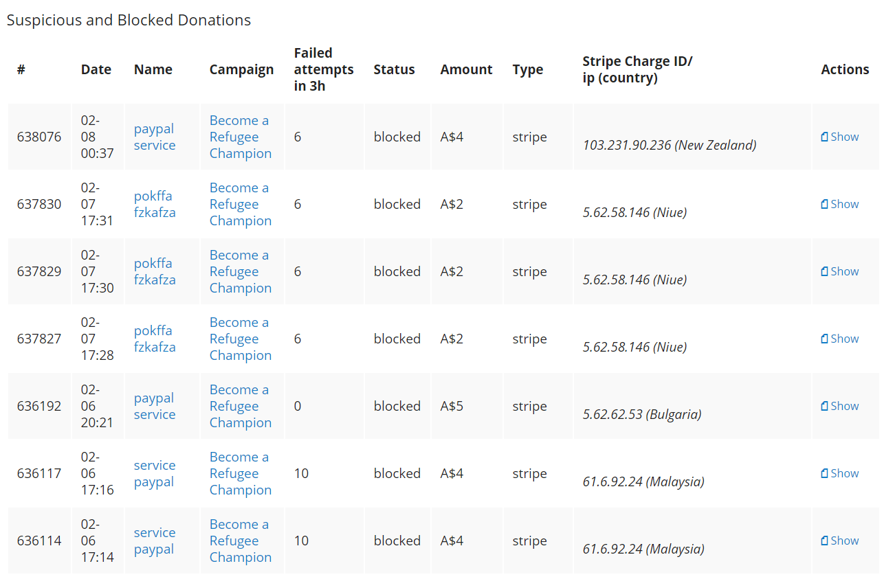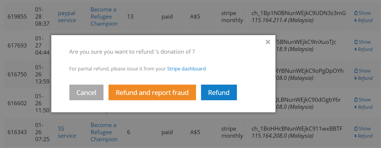 When reviewing suspicious donations, it may be helpful to check the country that the payment was made from. For example, if you are not expecting a donation to be made from Malaysia, you can refund the payment and report fraud.