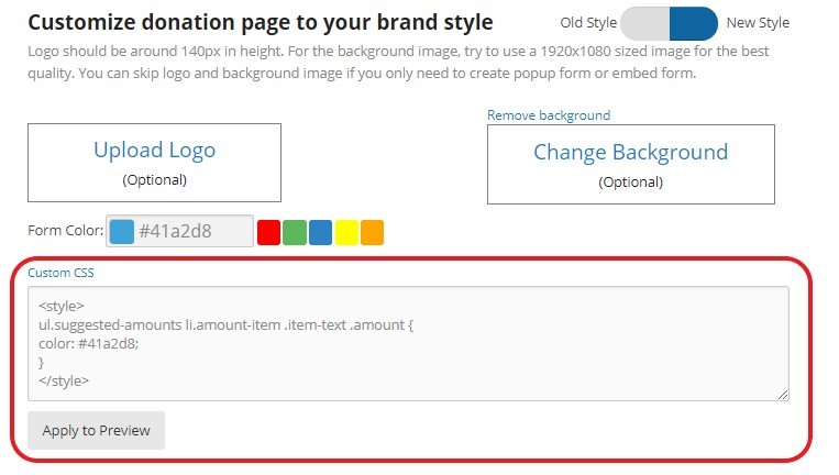 Not everyone has HTML coding experience and that’s ok. But if you want to make custom CSS changes to your Donorbox forms, you can. Simply type your code into the window and click Preview to see what your form will look like. If the thought of using Custom CSS terrifies you, we’ve made a small adjustment that we think you’ll like. If you don’t need this code block, simply click the Custom CSS link. This will collapse the code section so it doesn’t get in the way of your form editing.