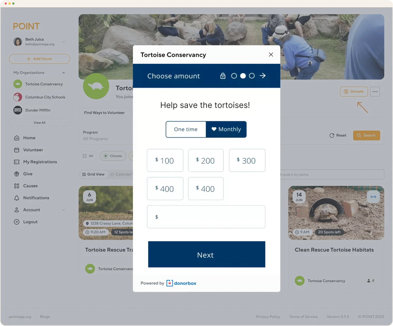 Fortunately, the Donorbox + POINT integration makes it super easy to convert more volunteers into donors! Connecting these two powerful tools keeps all your key donor data and information in one place while helping volunteers donate on the same platform where they sign up for your volunteer opportunities.
