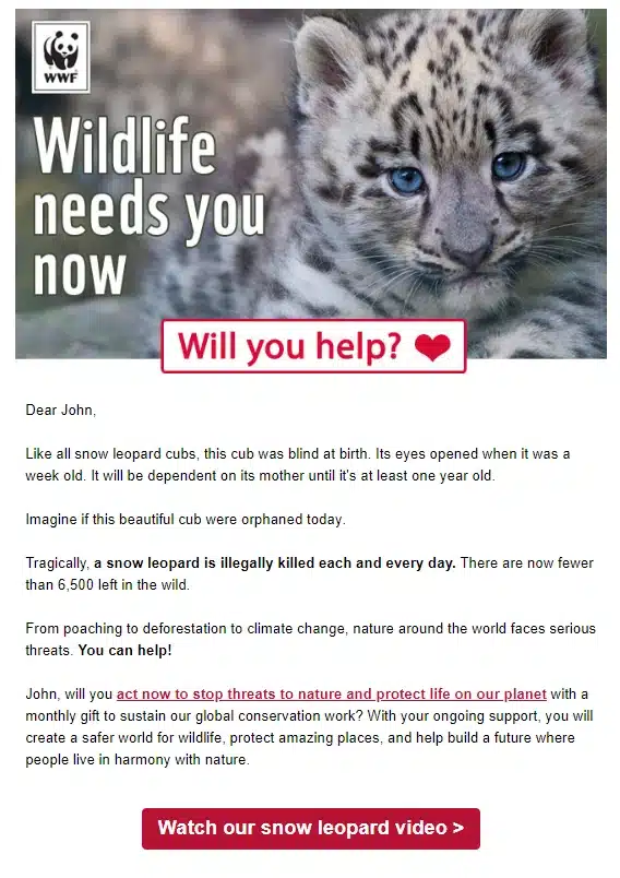 Emails like the one above fromthe World Wild Life Fund are a great way to educate and inspire your supporters. Try including statistics and figures in both your subject lines and in the body of your email. Don’t forget to add variables – they help personalize your messaging and there’s nothing better than recieveing a mail addressed directly to you.