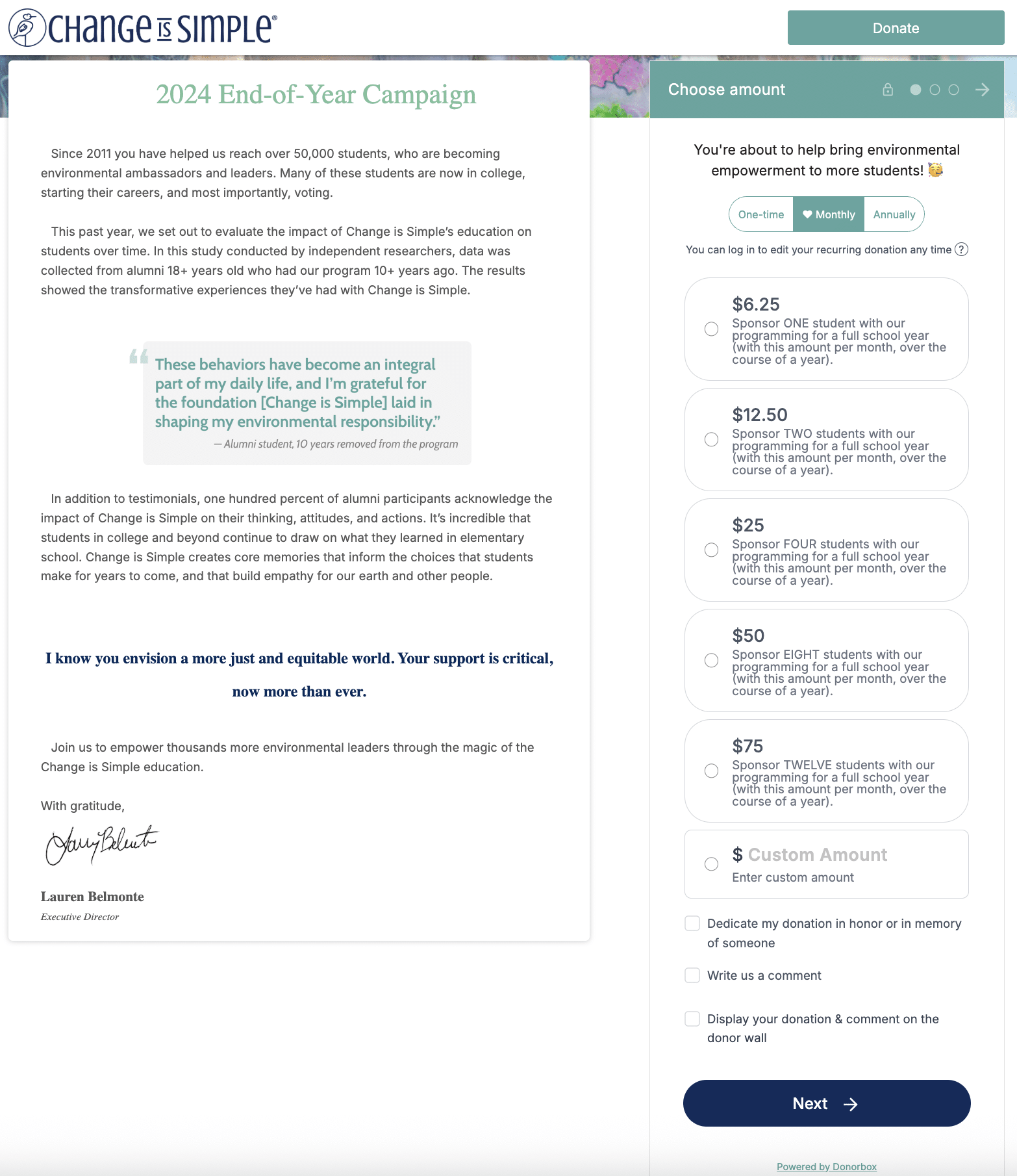 Establish giving levels: Provide suggested giving levels to increase the likelihood that you reach your fundraising goals. Look at your past donations to see if there are certain levels that come up frequently and include those as your suggested amount. However, leave a blank amount for those supporters who would prefer to give a different amount. Include these levels in your donation form too, so donors can choose the amount and complete the donation when being redirected to your donation page. See how Change is Simple does this with their year-end donation form.