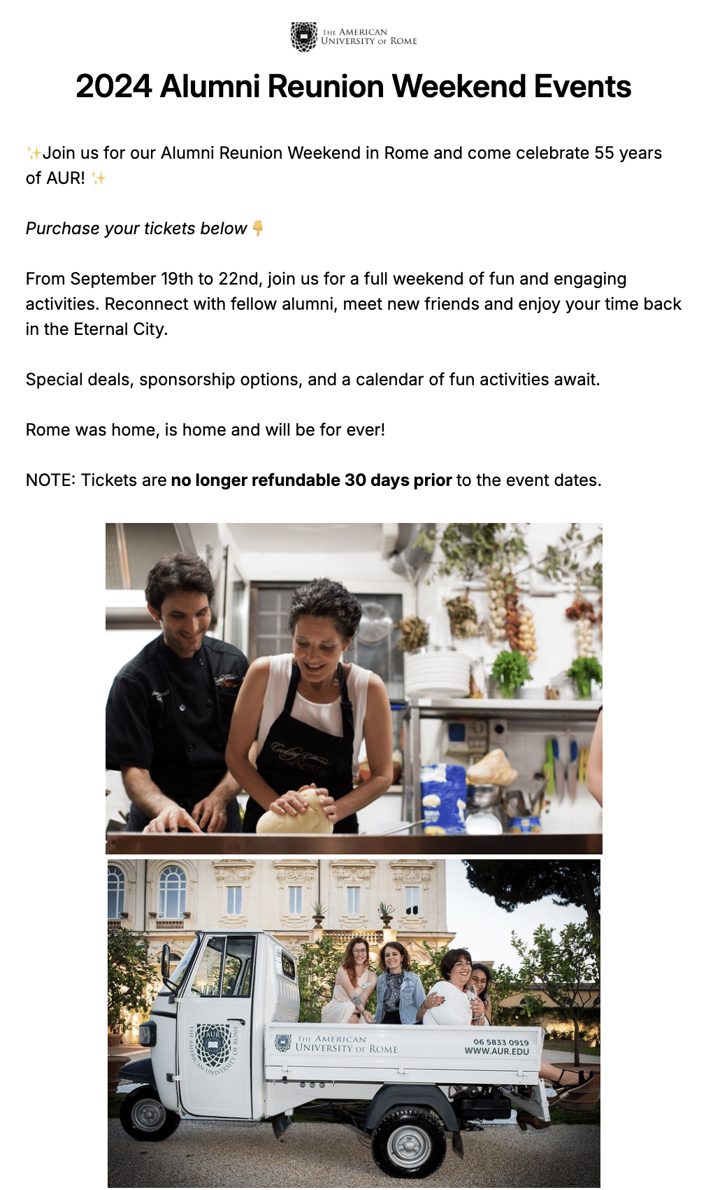 Provide food and drinks, and sell tickets to your event. See how the American University of Rome set up their event page on Donorbox Events. We love that they included all the necessary information – along with a warm welcome – on their Events page!