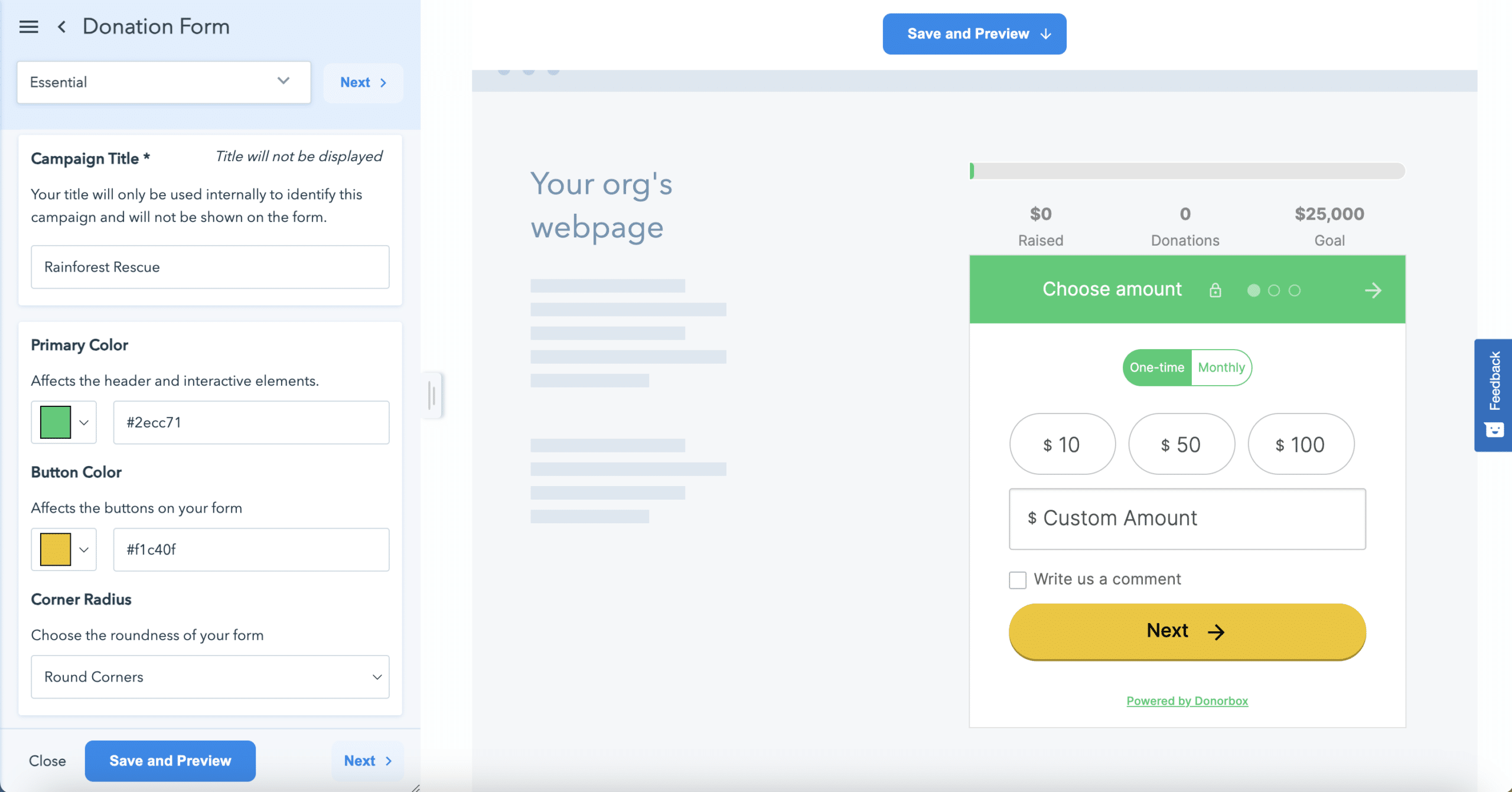 From there, you will be guided through each step of building your form. Customize your donation form to match your branding, add pre-filled donation amounts to your form, and choose up to four recurring donation intervals, setting one as preferred and one as default. You can also add additional questions and enable tribute and destination donations. For each change you make, you can hit “Save and Preview” to see how your choices will look.