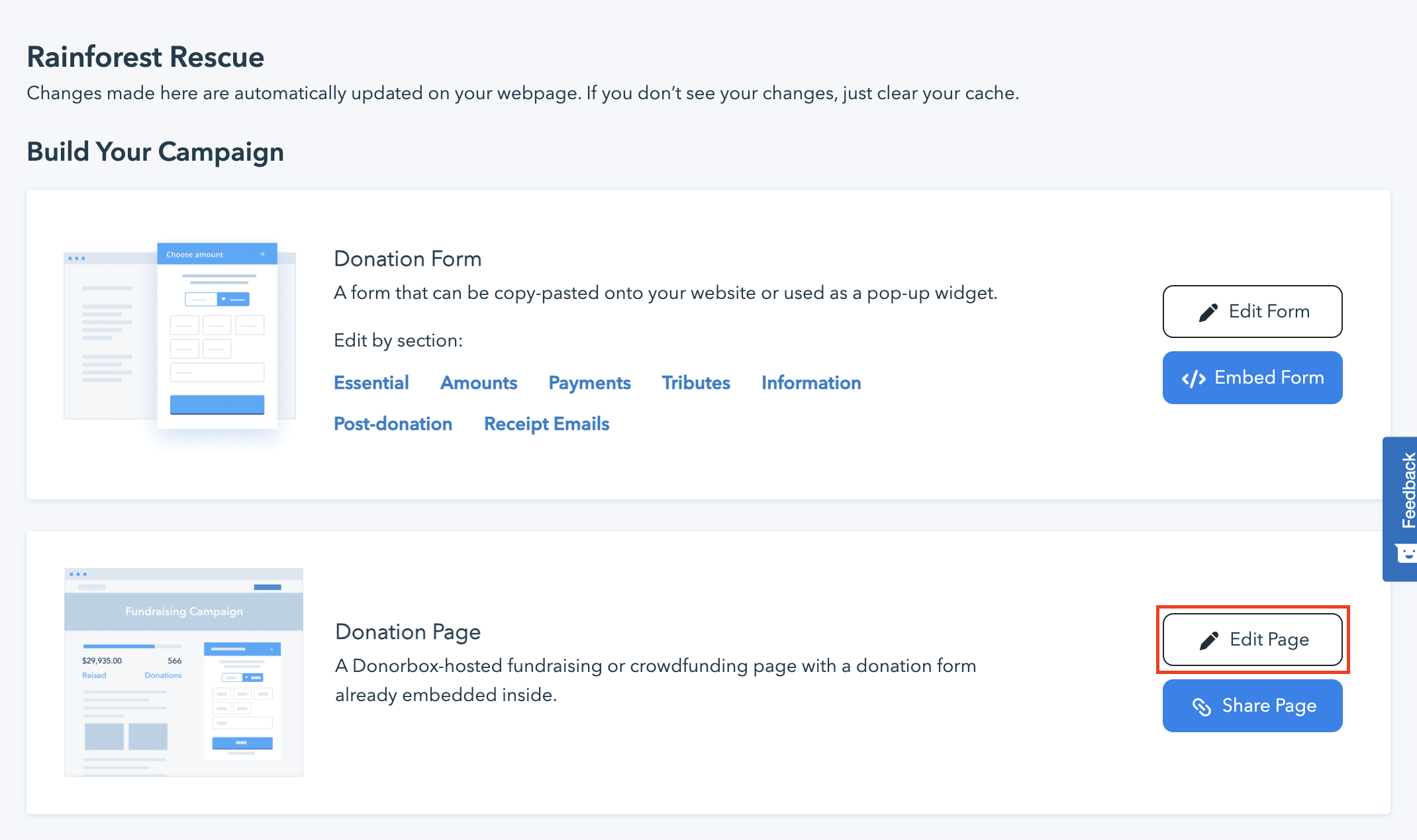 First, you’ll want to customize your donation page. Return to the campaign you created above and click “Edit Page” under “Donation Page.”