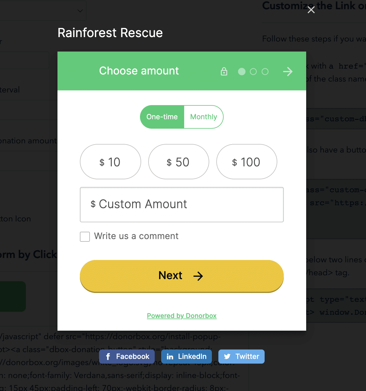 Our third option is the pop-up modal form. Instead of redirecting your donors to a separate donation page, you can make a donation form pop up as an on-screen overlay when someone presses the Donate button. This is a great way to collect donations without requiring your donors to navigate to a different page.