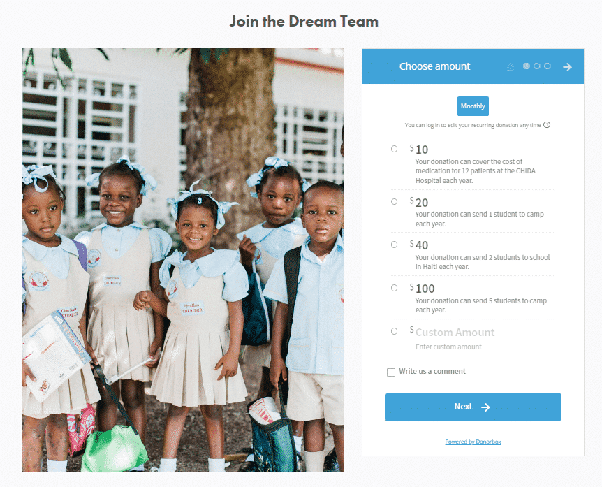 Donorbox Recurring Donations helps you set up monthly (as well as daily, weekly, bi-weekly, 1st and 15th, quarterly, and annual) giving programs for your fundraising campaigns. You can easily add these intervals to our recurring donation form. Then it’s up to you to either use the Donorbox-hosted fundraising page (where your form will be included) or embed the donation form in your website. Here’s an example of the latter: