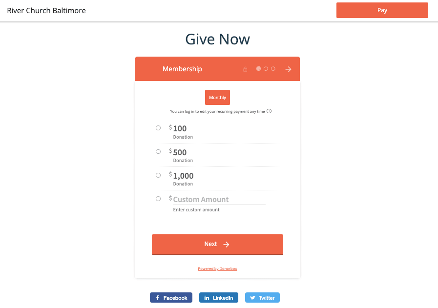 Donorbox helps you create membership campaigns with customizable tiers and a simple membership form. Embed the form on your website or host it for free on Donorbox. You can also manage the member records and payment information at the backend. Check out this membership campaign from River Church Baltimore, which is a simple but effective way to get started.