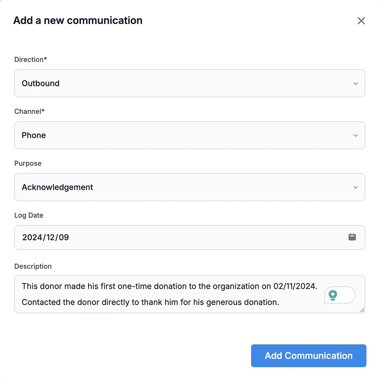 Donorbox helps you collect valuable donor information through its donation form. This information is then stored in the donor management system. You can manage your supporters from the backend easily, add any offline donations to their record that they’ve made during an event, add communication notes (shown below), and more.