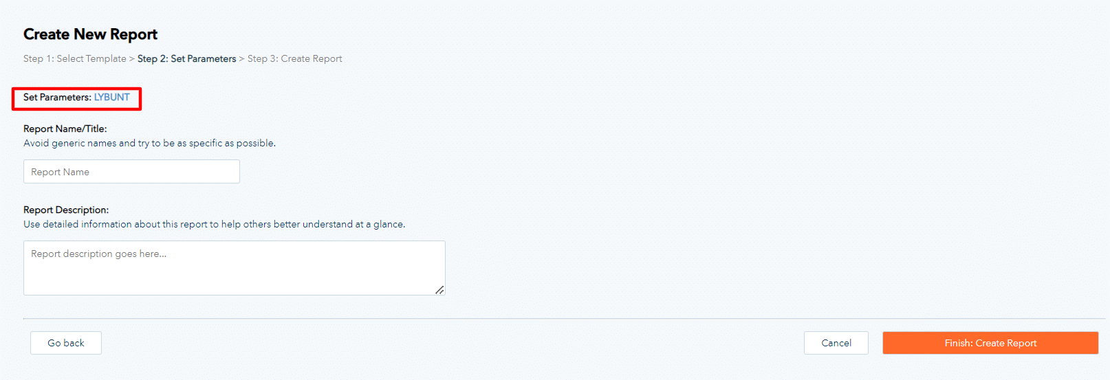 Here you’ll directly create LYBUNT reports without having to manually apply filters or segment donor data. You need to just select “LYBUNT” in the Reports module, give the report a name and description (as shown below), and that’s it!