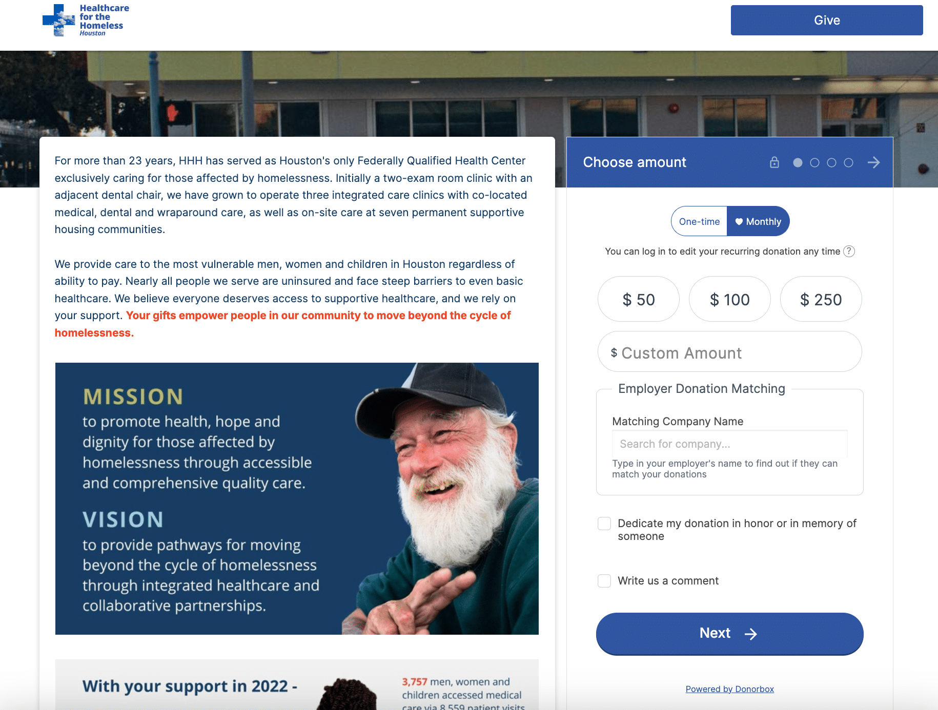Create a donation page and form that provides options for online donations. There are affordable online donation processors out there, so nonprofits should never skip adding this page to their website. The below donation page on Healthcare for the Homeless Houston is a great example.