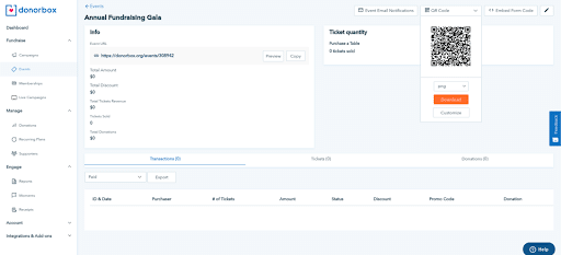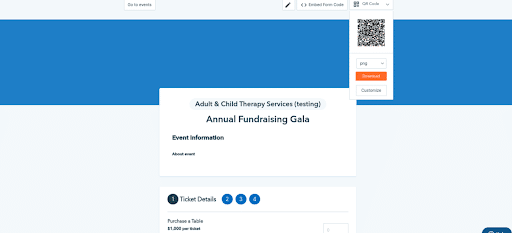 Donorbox also provides QR codes for events! Just create a new event or edit an event on your Donorbox dashboard and you can customize and download the QR code so supporters can easily purchase tickets and find event details on their mobile device.
