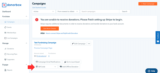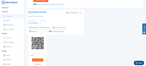 Go to your Donorbox dashboard, select a campaign, and find the QR code below your campaign name. Click the dropdown next to it, select the file type, and download to spread the word.