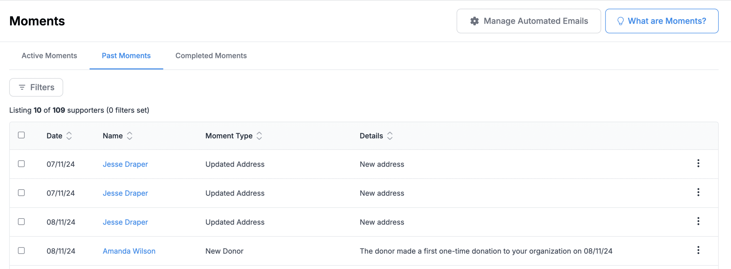 To help, Donorbox CRM – our all-in-one donor management software – offers a dedicated feature, called Moments. Moments automatically notifies you about important donor moments/events based on specific donor actions, including when a donor has: