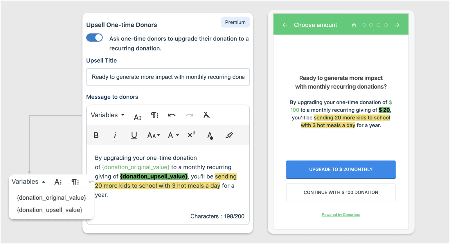 Customize your call-to-action and body text to appeal to your donors’ emotions with sincere messaging or align with a specific giving campaign. And, you can choose to display the original and monthly donation values. This lets donors know how great an impact they can have on your cause when they sign up for your monthly giving program – boosting transparency and trust that scales support for your cause!